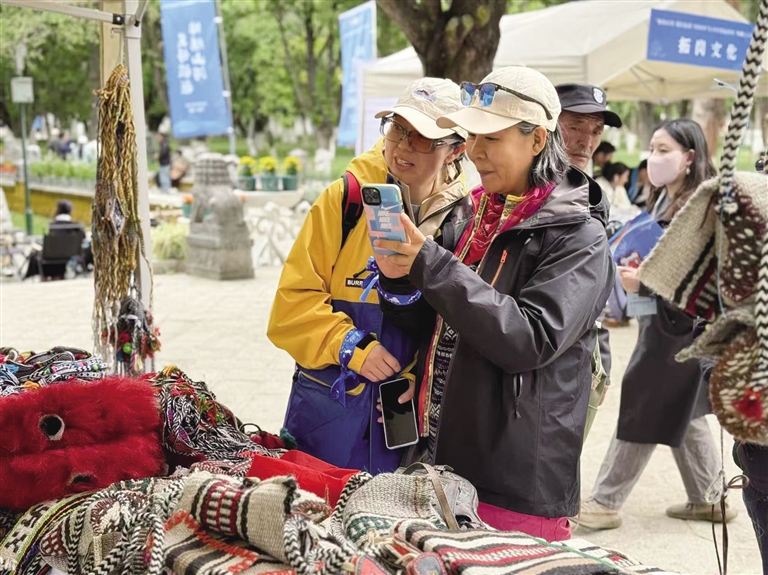 在西藏“非遺”文化體驗(yàn)區(qū),來(lái)自湖南的游客張麗一邊挑選包包一邊感嘆:“哇噻,真的太神奇了!沒(méi)想到牦牛毛還可以做成這么漂亮的包包,我要多買(mǎi)幾個(gè)帶回去給朋友。還能把這份獨(dú)特的文化記憶帶回家?!?/p>