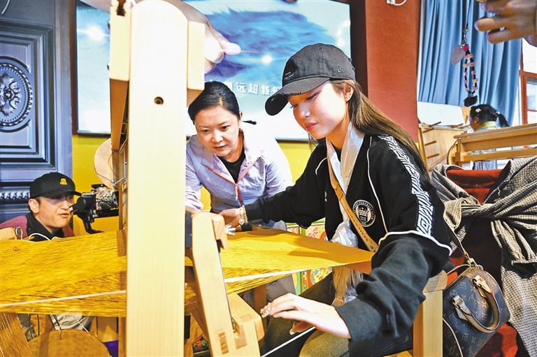 日本游客在體驗氆氌編織技藝。