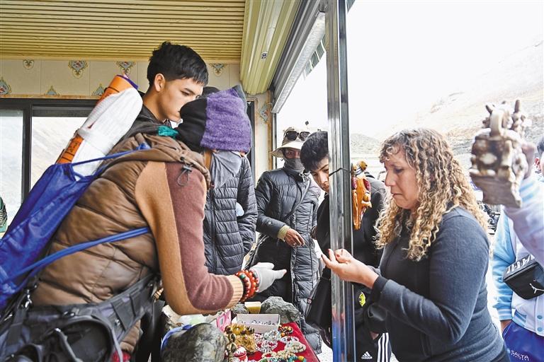 新奇感過后,游客們開啟購物模式?!鞍⒓?,這個掛飾可以定制嗎?”“你們可以發(fā)快遞嗎?”對于一連串的問題,阿佳格桑忙碌地一一回答著,“你們想要什么圖形,我們就給你定制什么圖形。”“我們這兒快遞很快,今天下單明天就給你發(fā)!”短短半個小時,“阿佳格桑工坊”的生意火爆,銷售藏式靠墊、藏式地毯、掛飾等特色產(chǎn)品4000多元?!盎厝ズ?,我要通過自媒體平臺,宣傳這次西藏之旅的所見所聞,讓更多親朋好友來西藏旅游!”日本游客琴音有感而發(fā)。