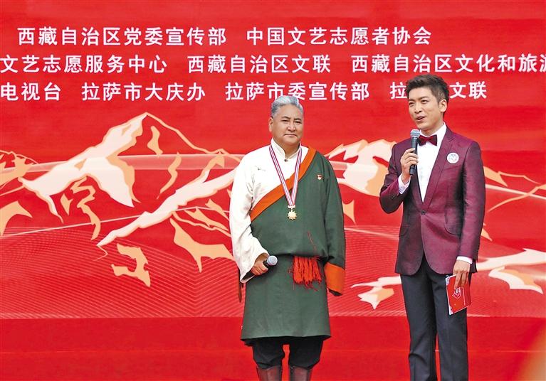 5月23日,在中國文藝志愿者服務(wù)日到來之際,由中國文聯(lián)、西藏自治區(qū)黨委宣傳部、中國文藝志愿者協(xié)會共同主辦的“與人民同行”慰問演出在西藏會展中心廣場隆重舉行。這場慶祝西藏自治區(qū)成立60周年的文藝盛宴,在歌舞《鼓舞西藏》激昂的節(jié)奏中拉開帷幕。