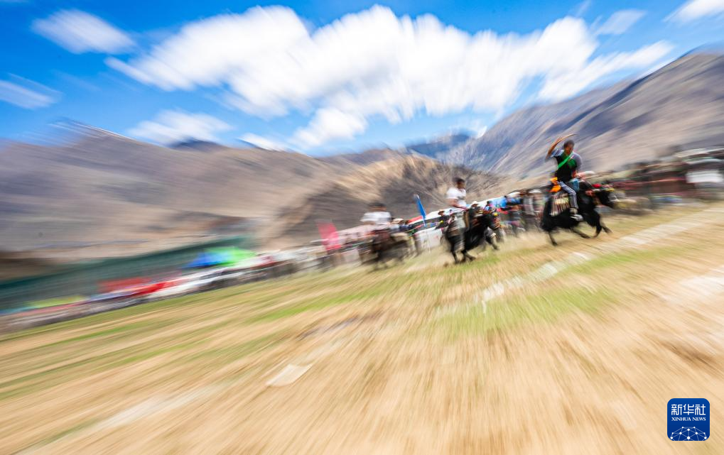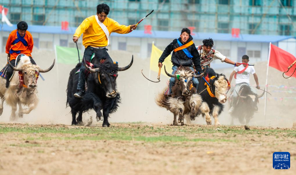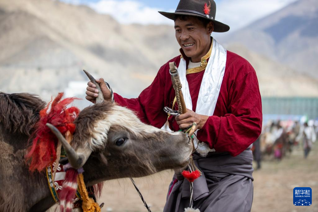 5月29日,當?shù)剞r(nóng)牧民群眾在賽牦牛比賽中。新華社記者 丁增尼達 攝