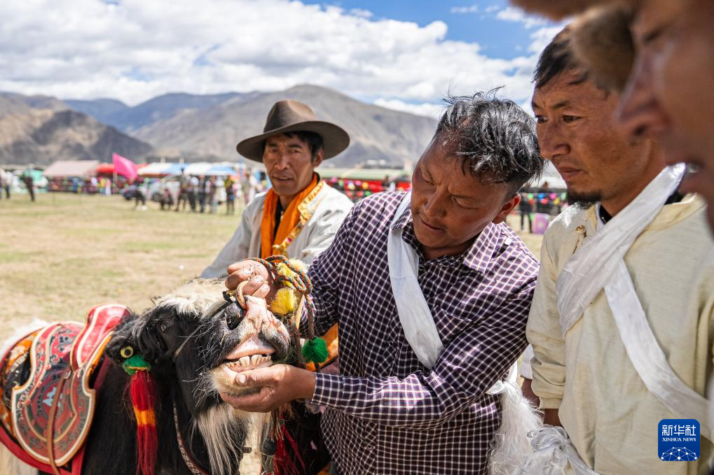 5月29日,工作人員通過檢查牦牛牙口判斷其是否具備參賽資格。新華社記者 丁增尼達 攝