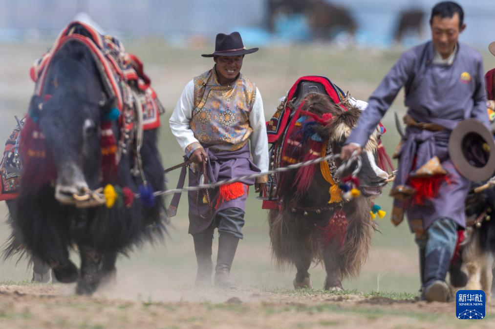 5月29日,農(nóng)牧民群眾在賽牦牛比賽前,牽著牦牛前往起點。新華社記者 丁增尼達 攝