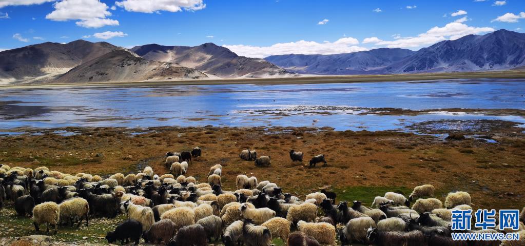 羊群經(jīng)過西藏定結(jié)縣一處湖邊的草地(5月13日攝,手機照片)。新華社記者 沈虹冰 攝