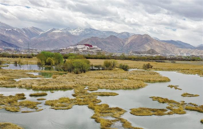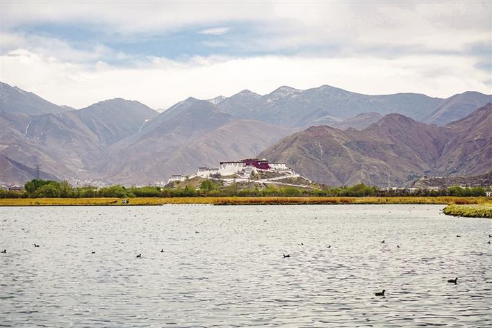 從拉薩市當熱西路上向北望去,便能看到這塊北面靠山,東、南、西三面為市區(qū)包圍,面積12.2平方公里的濕地。遠處,連綿起伏的山頂還覆蓋著薄薄的積雪,布達拉宮雄偉而秀美;近處,濕地內隨意顯現(xiàn)出的一塊塊水泊,成群的候鳥在水中玩耍嬉戲、在藍天白云下飛舞。拾階過橋,一條木質長廊向濕地中延伸,只是我們這些不速之客的到來,驚起水鳥無數(shù)。它們仿佛商量好似的沖上藍天,讓人為打擾它們的棲息而不安。