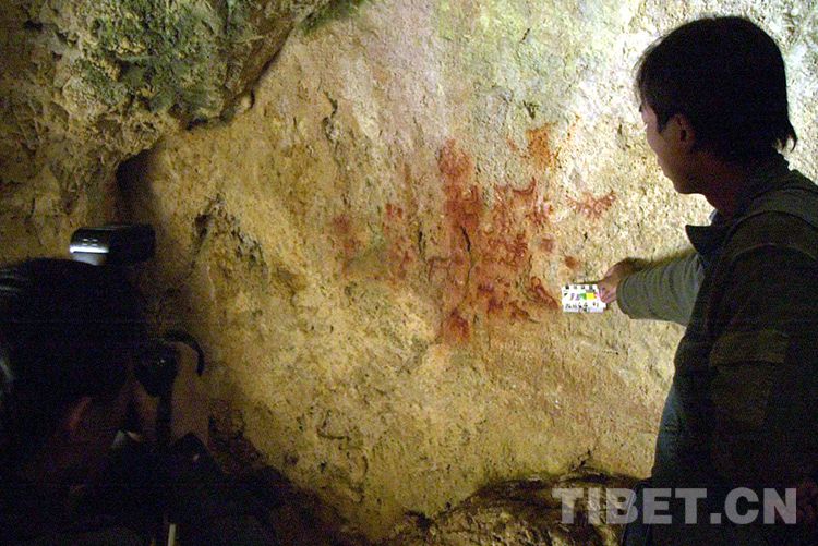這是科考人員在對(duì)一處洞穴巖畫進(jìn)行考察(唐召明2001年攝)