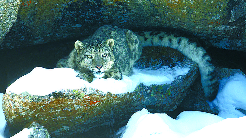 2月14日在三江源國家級自然保護(hù)區(qū)年保玉則保護(hù)分區(qū)內(nèi)拍攝到的成年雪豹。華卡加 攝