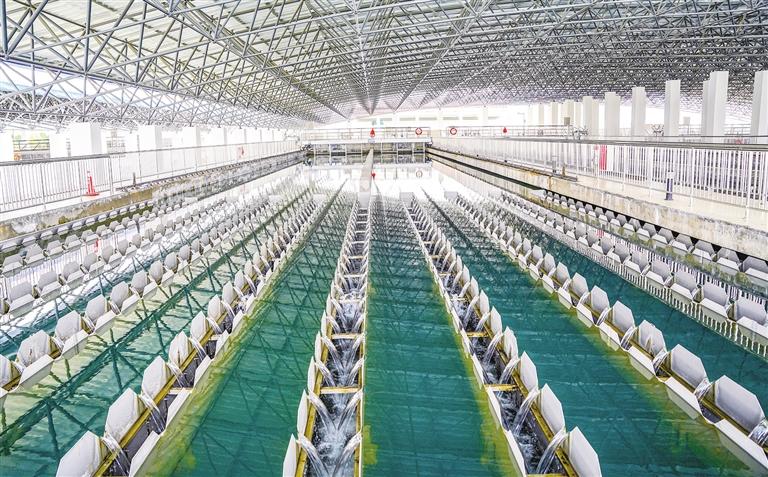 為了解居民的生活用水如何從大自然被搬運(yùn)到千家萬戶,記者驅(qū)車來到納金水廠一探究竟。據(jù)納金水廠副廠長申雅薈介紹,納金水廠于2016年開始籌建,2019年投入使用,是一座高原規(guī)模最大、最具標(biāo)志意義的地表水廠。廠區(qū)建設(shè)用地面積為182.8畝,設(shè)計(jì)供水能力48萬立方米/日,輸配水管道132.2千米。目前,納金水廠作為主供水源為全市供水,平均日供水量為41萬立方米,承擔(dān)了全市約90%的供水重任。