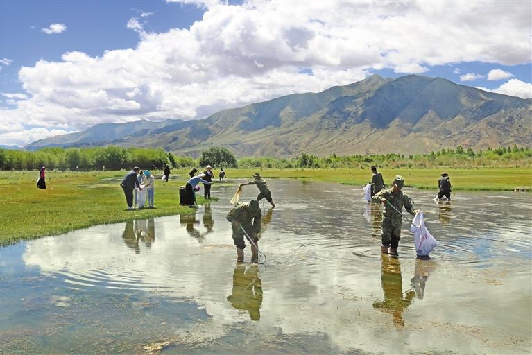 綠水青山就是金山銀山。為全面貫徹黨的二十大精神,充分尊重自然、順應(yīng)自然、保護(hù)自然,提高廣大黨員骨干的綠色環(huán)保意識,近日,日喀則市桑珠孜區(qū)人民武裝部聯(lián)合桑珠孜區(qū)退役軍人事務(wù)局,組織官兵與江當(dāng)鄉(xiāng)、年木鄉(xiāng)退役軍人、民兵黨員在雅江中游河谷黑頸鶴保護(hù)區(qū)開展“呵護(hù)綠水青山”主題黨日活動。活動中,桑珠孜區(qū)人民武裝部組織重溫入黨誓詞,隨后,30多名黨員開展拉網(wǎng)式清理水域漂浮物和白色垃圾,給“高原精靈”營造一個美麗舒適的“家”。