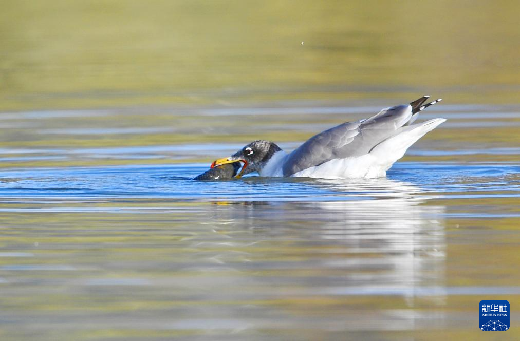 在西藏拉薩拉魯濕地,一只漁鷗在水里捉到魚(yú)(10月3日攝)。新華社記者 張汝鋒 攝