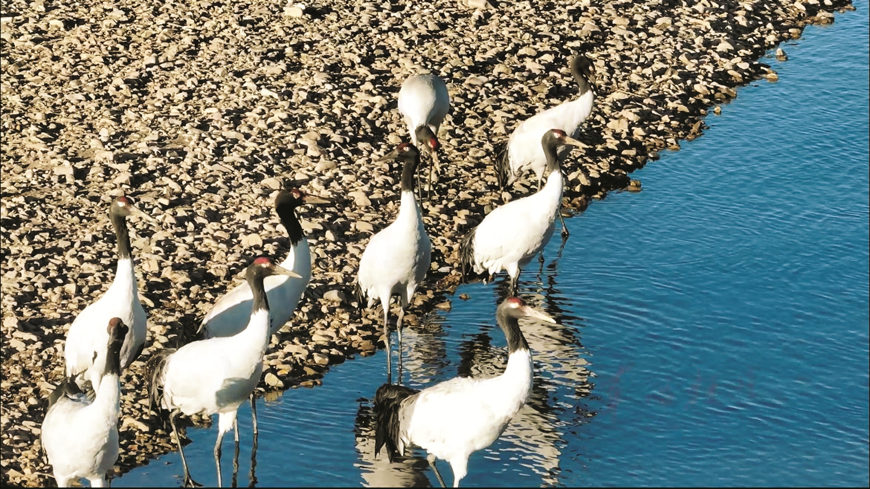圖為黑頸鶴在湖邊覓食。拉薩融媒記者 大索朗曲珍 攝