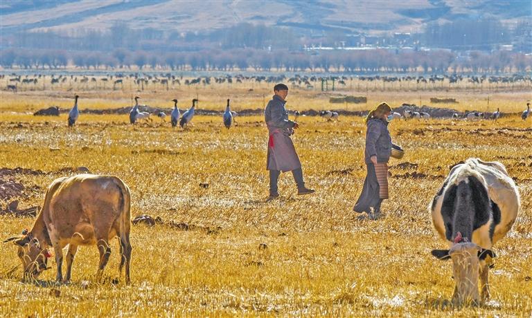 近年來,林周縣依據(jù)檢測情況和黑頸鶴棲息特點(diǎn),建立了10個投食點(diǎn),每年分4個階段在投食點(diǎn)投放青稞、冬小麥約1.7萬斤,通過采取不定時喂食,補(bǔ)充黑頸鶴食源。