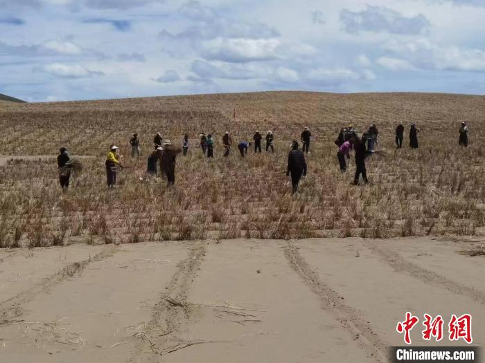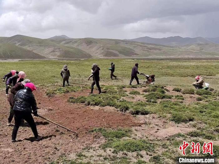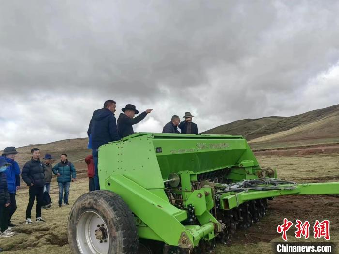 圖為官方檢查試驗田草種子發(fā)芽情況。果洛州瑪沁縣自然資源和林業(yè)草原局 供圖