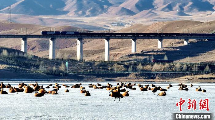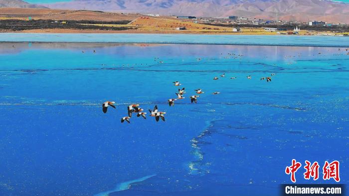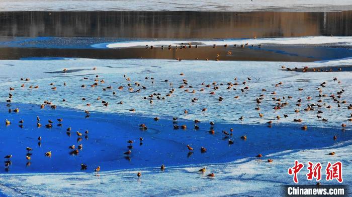 高原冬日,在位于青海湖北岸的青海省海北藏族自治州海晏縣境內(nèi),成群的赤麻鴨、綠頭鴨等鳥類現(xiàn)身青海省東大灘水庫,它們時而“泡湯”洗浴,時而振翅高飛,時而覓食嬉戲,展現(xiàn)出一幅冬日和諧的美好畫面。近年來,越來越多鳥類來到青海湖北岸覓食休憩,此時一半冰層一半碧波的東大灘水庫成了鳥類覓食的好去處。