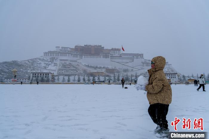 圖為1月18日,拉薩迎來2024年首場大雪,一位孩子在布達(dá)拉宮廣場玩雪。江飛波 攝