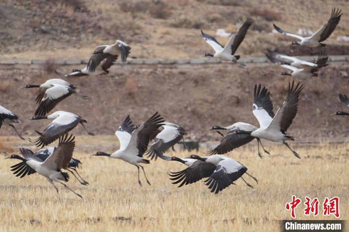 圖為黑頸鶴在林周縣境內的農(nóng)田里覓食、嬉戲。貢嘎來松 攝