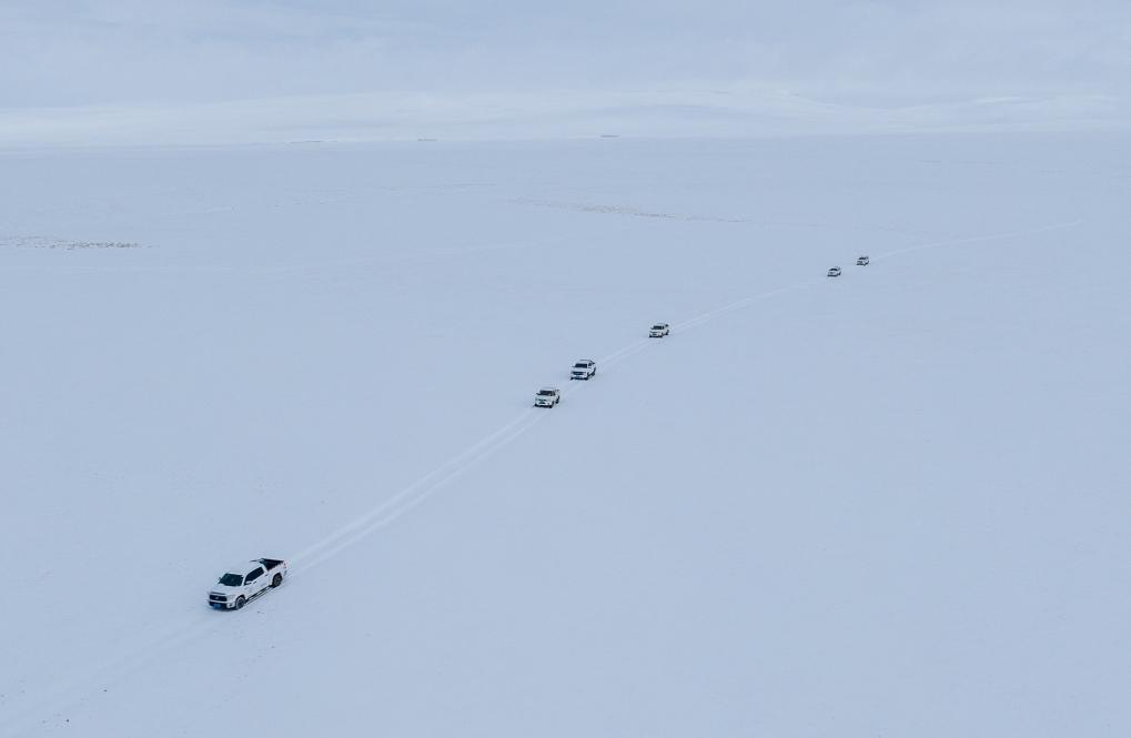 離開尼瑪縣城,巡山隊伍沿土路行進。很快,土路沒有了,車隊只能沿著之前巡山時留下的車轍走。找不到車轍的時候,山就是路標(biāo)。