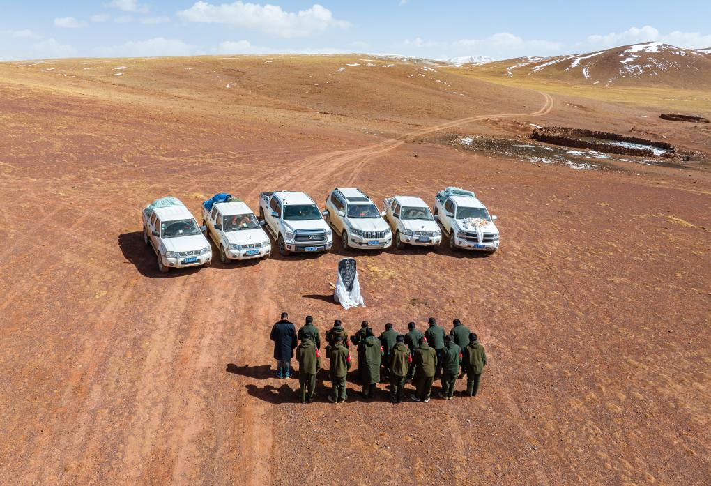 野生動物專業(yè)管護隊員在羅布玉杰烈士紀(jì)念碑前默哀致敬(無人機照片,5月10日攝)。新華社記者 姜帆 攝