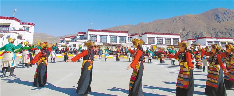 文藝事業(yè)繁榮興盛,全區(qū)共有10個專業(yè)文藝團體、76個縣區(qū)藝術(shù)團、153個民間藏戲隊、395個鄉(xiāng)鎮(zhèn)文藝演出隊,所有行政村成立群眾文藝演出隊。圖為西藏自治區(qū)扎囊縣德吉新村群眾文藝演出隊開展演出活動。