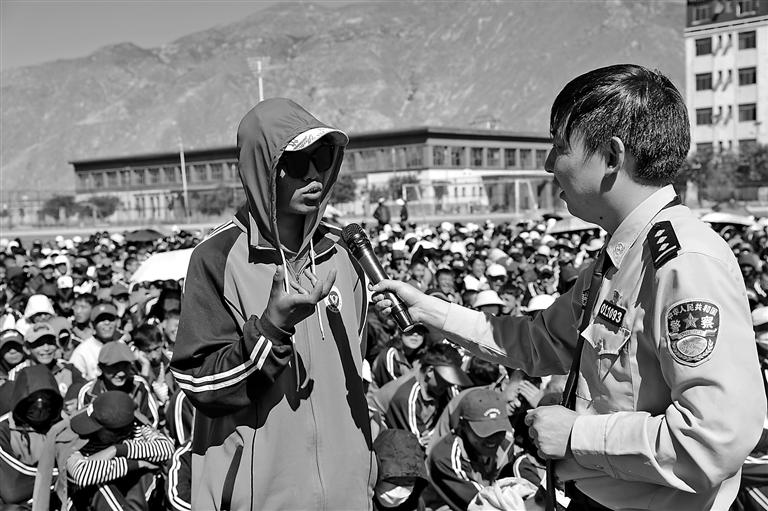 宣傳活動中,拉薩市第一中等職業(yè)技術(shù)學(xué)校學(xué)生和區(qū)公安廳網(wǎng)安總隊民警熱情互動。記者 彭琦 攝