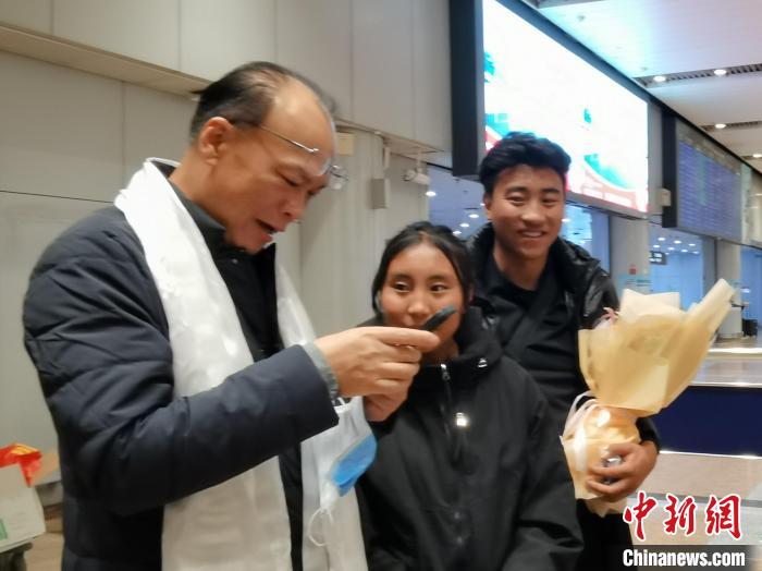 11月14日下午,來(lái)自西藏自治區(qū)昌都市的8名脊柱側(cè)彎患者到達(dá)北京首都國(guó)際機(jī)場(chǎng)。圖為北京大學(xué)第一醫(yī)院骨科主任李淳德(左)和藏族女孩澤巴央宗、哥哥貢布鄧珠交談?!⌒煅┈?攝