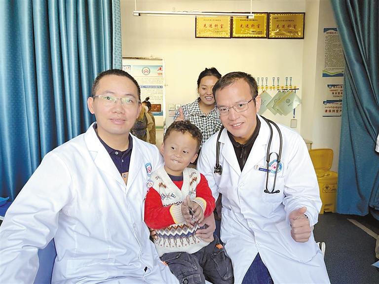 援藏醫(yī)療隊廖森成醫(yī)生與前來篩查的兒童合影。