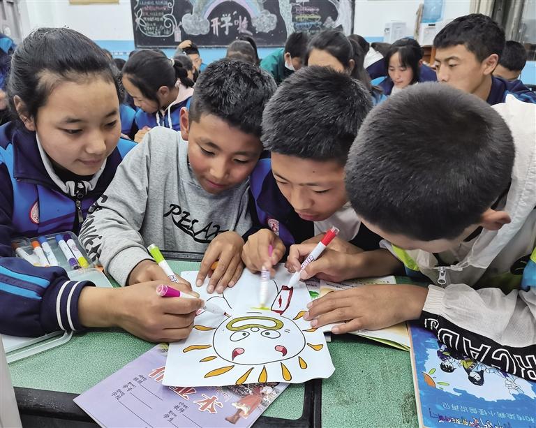 “通過拉巴卓瑪?shù)倪@幅畫,我了解到她是一個很有想法的孩子,她很清楚自己想要什么。課程剛開始時,我觀察到她一個人坐在角落里,低著頭,也不怎么和旁邊同學說話,但是通過這個課程的開展,她會在課后主動跑來和我說她近期遇到的困惑,我感覺到她正逐漸敞開心扉,這與我們當初開設這個課程的初心是一樣的。我們就是希望可以通過這些課程,讓當?shù)氐膶W生在心理方面得到更多的開導、正視自己的情緒,并從中去獲得一些能量,所以現(xiàn)在看到她的變化,我很高興。”王婕婷說。