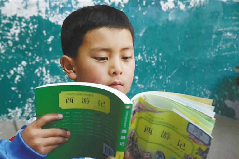 拉薩市第一小學(xué)一年級5班學(xué)生圖丹嘉認(rèn)真閱讀同學(xué)贈送的課外讀物。