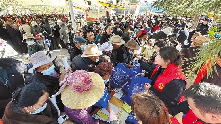 拉薩市直單位工作人員在宗角祿康公園為市民講解民生政策并發(fā)放宣傳手冊。