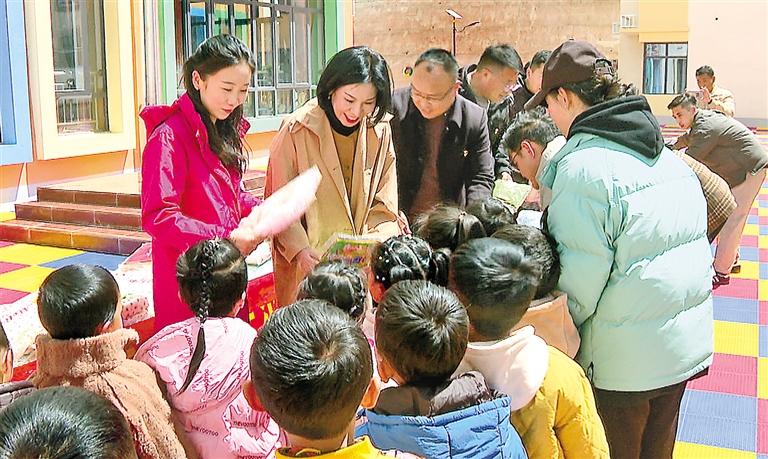 圖為天津援藏貢覺工作隊隊員為幼兒園兒童發(fā)放書籍。西熱旦青 記者 平措郎加 攝