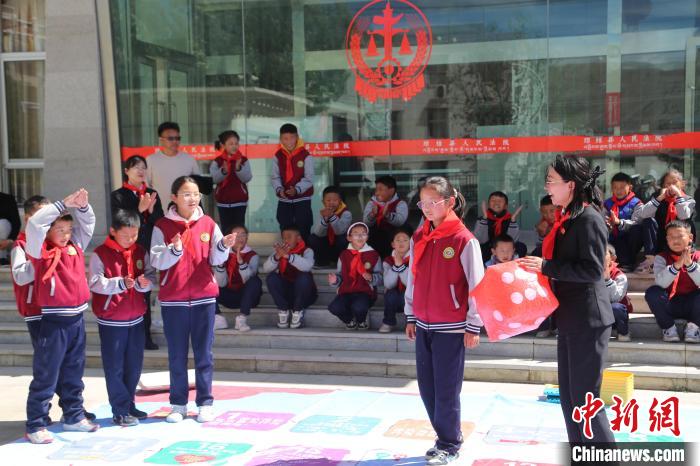 圖為學(xué)生們正在和法院干警一起參加超大棋盤(pán)游戲。倫珠澤仁攝