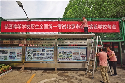 6月6日,記者在北京航空航天大學(xué)實驗學(xué)校中學(xué)部(簡稱“北航實驗學(xué)校”)考點看到,學(xué)校西門處已懸掛起高考考點橫幅、考場布置已就位,校園內(nèi)放置了多個溫馨的提示語標牌。據(jù)悉,該校是今年新增高考考點之一,承接來自9所學(xué)校277名考生的高考組考任務(wù)。此外,記者還探訪了北京高考人大附中經(jīng)開學(xué)??键c