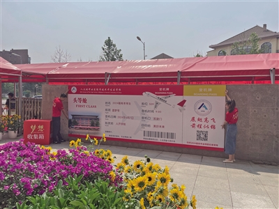 “2024高考加油”“高考就是高高興興地考試”“保持靜心,增強信心,做題專心,考試細心”……考生一進考點,就可以看到這些鼓舞人心的標語。走出考點時,一張巨型“圓夢號”頭等艙登機牌映入學(xué)生眼簾,祝福考生們展翅高飛,前程似錦。