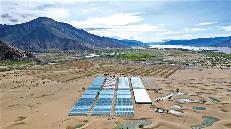 國家農(nóng)業(yè)產(chǎn)業(yè)化示范企業(yè)——西藏綠之源現(xiàn)代農(nóng)業(yè)科技股份有限公司二期項(xiàng)目,如同一片“綠洲”鑲嵌在沙丘之中。