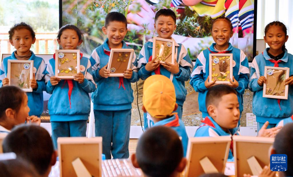 8月15日,拉魯小學(xué)的學(xué)生在拉魯濕地國(guó)家級(jí)自然保護(hù)區(qū)管理局科普小教室里向大家展示優(yōu)秀植物標(biāo)本。新華社記者 張汝鋒 攝