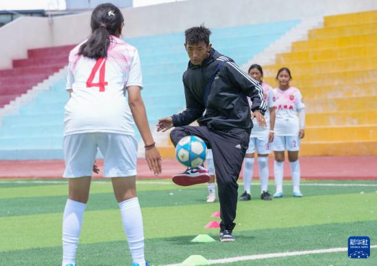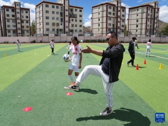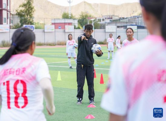 西藏日喀則市上海實(shí)驗(yàn)學(xué)校“珠峰雪鷹”女子足球隊(duì)教練洛布桑在操場上指導(dǎo)球員訓(xùn)練(9月3日攝)。新華社記者 丁汀 攝