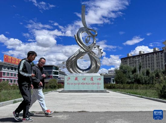 “珠峰雪鷹”女子足球隊(duì)教練洛布桑(前)與王劍平在校園里交流(9月3日攝)。新華社記者 丁汀 攝