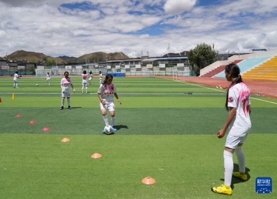 在西藏日喀則市上海實(shí)驗(yàn)學(xué)校,“珠峰雪鷹”女子足球隊(duì)隊(duì)員們?cè)诓賵錾嫌?xùn)練(9月3日攝)。新華社記者 丁汀 攝