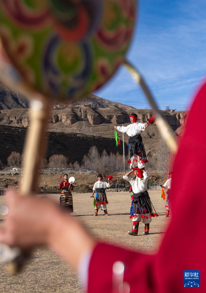 西藏昌都市丁青縣尺犢鎮(zhèn)烏巴村文藝演出隊(duì)在跳熱巴舞(1月5日攝)。新華社記者 丁增尼達(dá) 攝