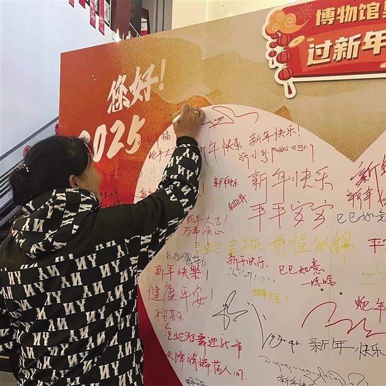 活動(dòng)期間,博物館大廳的新年愿望墻備受歡迎,成為觀眾們的熱門(mén)打卡點(diǎn)。人們紛紛在心愿貼上寫(xiě)下對(duì)新年的美好期許,隨后領(lǐng)取博物館精心準(zhǔn)備的節(jié)日紀(jì)念品。同時(shí),博物館推出的集卡集章活動(dòng)也吸引了眾多參與者。觀眾們通過(guò)參與館內(nèi)各項(xiàng)活動(dòng)收集紀(jì)念章,就有機(jī)會(huì)在年末收獲博物館準(zhǔn)備的神秘大獎(jiǎng),這一活動(dòng)極大地激發(fā)了大家的參與熱情。