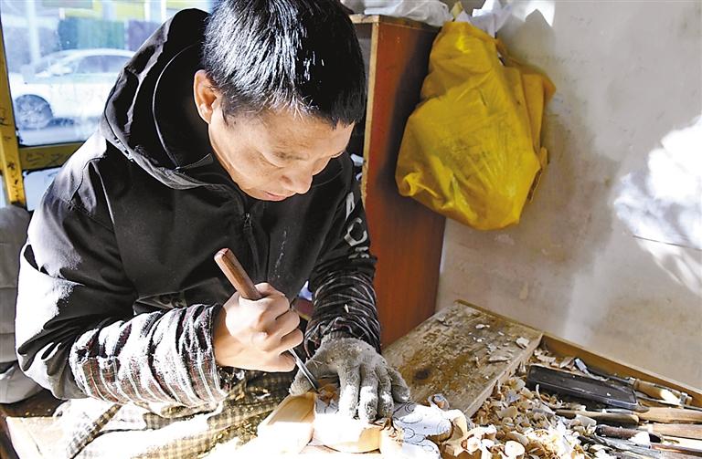 來自林周的多吉正在位于城關(guān)區(qū)內(nèi)的木雕工作室學習木雕技藝。記者 曲珍 攝