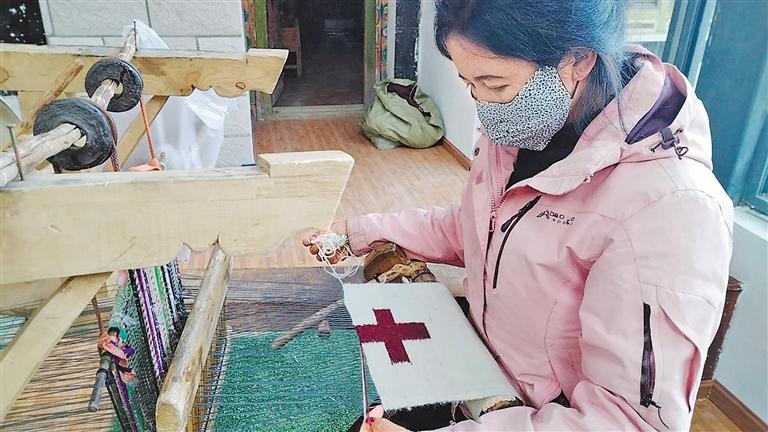 在這里,一場(chǎng)編織技能培訓(xùn)正在進(jìn)行,婦女們的雙手在織線之間來(lái)回游走穿梭,正專(zhuān)注地編織著藏式包、卡墊等各種手工藝品。