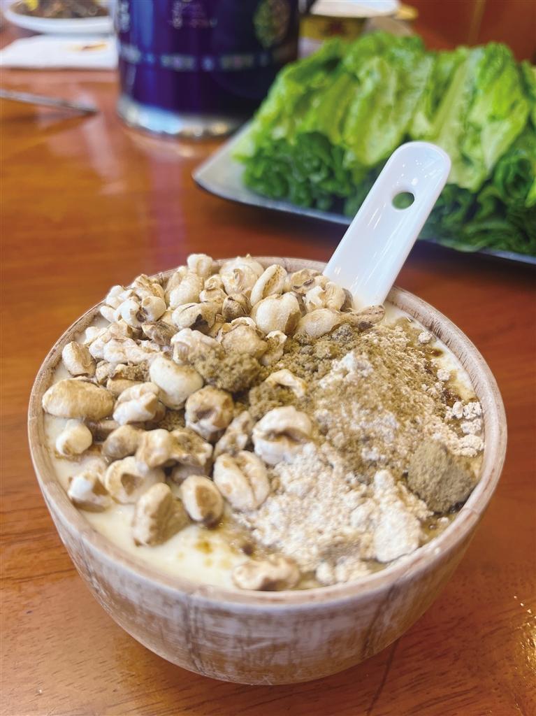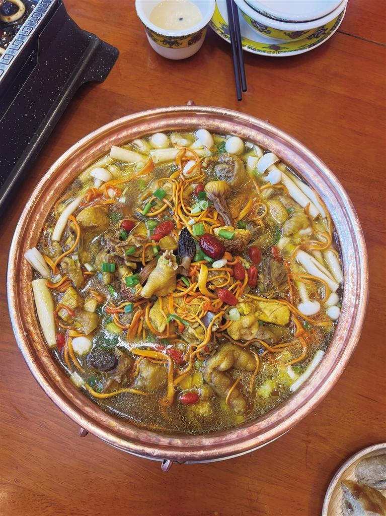 傳統(tǒng)的藏式牦牛肉火鍋講究原汁原味,湯底通常選用牦牛骨熬制數(shù)小時,加入少許鹽和香料即可。鍋底先鋪上一層時蔬和粉絲,再鋪一層牦牛肉排,最上面是土豆、蘿卜、白菜、青筍、木耳等耐煮的蔬菜,再加上肥瘦相間的新鮮牦牛肉慢慢燉煮。各類食材的香味相互碰撞,別提多香了!為了不掩蓋食物本身的香氣,藏式牦牛肉火鍋的蘸料通常比較簡單,可以用辣椒醬、蔥花、香菜等調(diào)制,也可以根據(jù)個人喜好加入芝麻醬、腐乳等。牦牛肉火鍋味道濃郁,建議搭配清淡的酥油茶或甜茶等飲品。