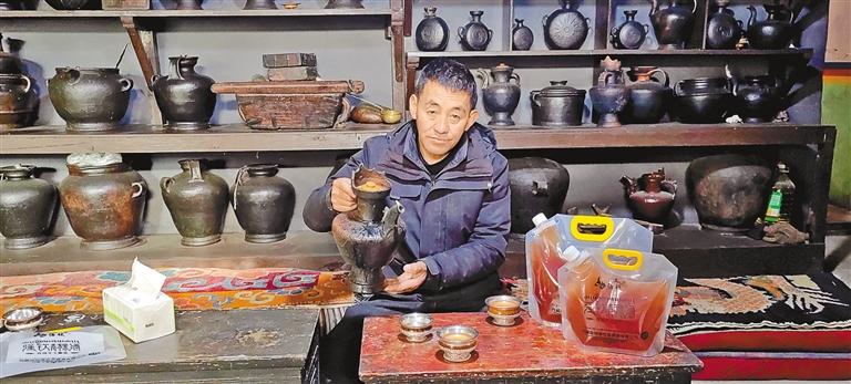 洛桑多吉在自家工坊內(nèi)品嘗自釀的“強(qiáng)欽青稞酒”。
