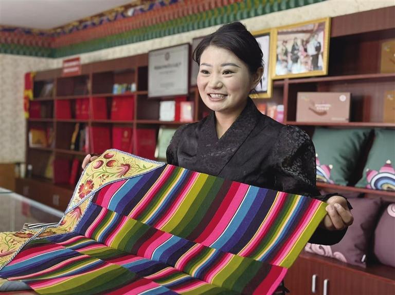 2018年,她帶著杰德秀邦典亮相貢嘎縣“七彩邦典”文化節(jié),參展的巨型邦典被錄入吉尼斯世界紀(jì)錄,訂單如雪花般飛來。如今,合作社產(chǎn)品遠銷日本、印度、尼泊爾等10余個國家,年營收突破200萬元。在合作社的38名固定員工中,有4名貧困戶、3名殘疾人。