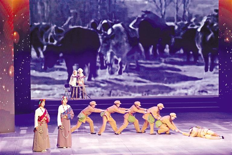 昌都市代表隊(duì)率先登臺(tái)。他們帶來(lái)的《星火照天路》,通過(guò)進(jìn)藏女兵跨越70年的隔空對(duì)話,講述當(dāng)年修建“兩路”的難忘歲月。