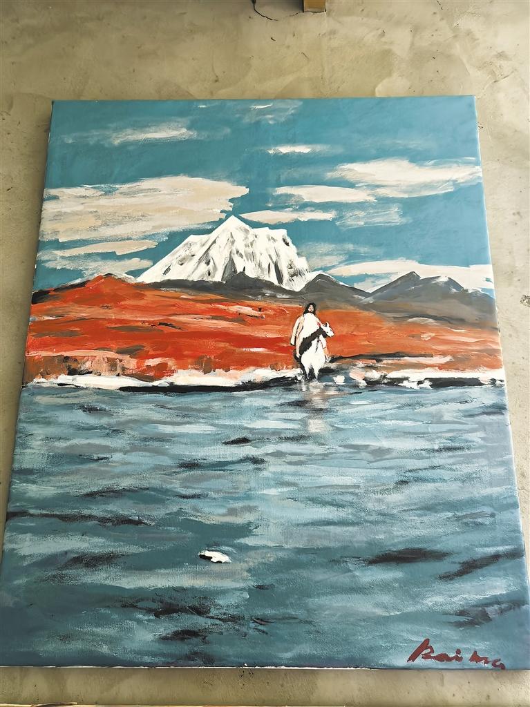 在絕望的深淵里,這片土地深沉的力量和藝術(shù)創(chuàng)作的本能召喚,讓他抓住了救贖的繩索。他用了漫長(zhǎng)光陰,艱難地完成了這場(chǎng)精神的浴火涅槃:重新拾起寫詩的筆,鋪開作畫的紙,用文字和色彩,一步一個(gè)腳印地跋涉,終于走出了那場(chǎng)“淋了10多年的大雨”。他決然放下沉重的過往,以“白瑪次仁”之名擁抱新生,將一路的風(fēng)霜、藏地的壯美與故事,化作筆下的詩行與畫布上的色彩,在藝術(shù)的熔爐中淬煉出一個(gè)全新的自我。