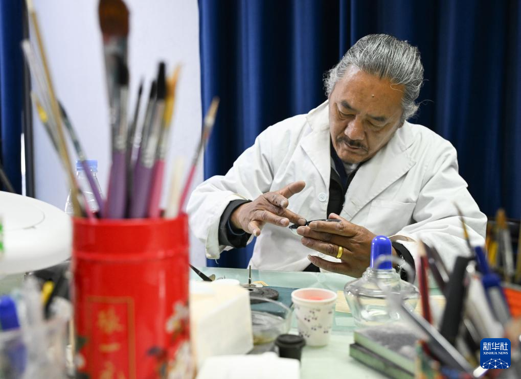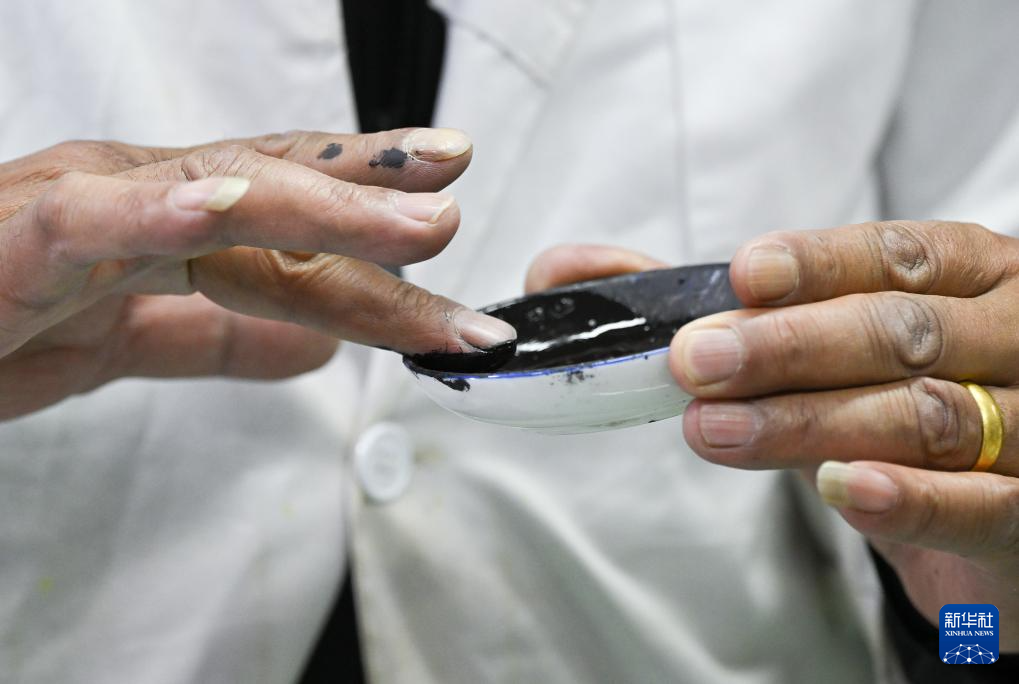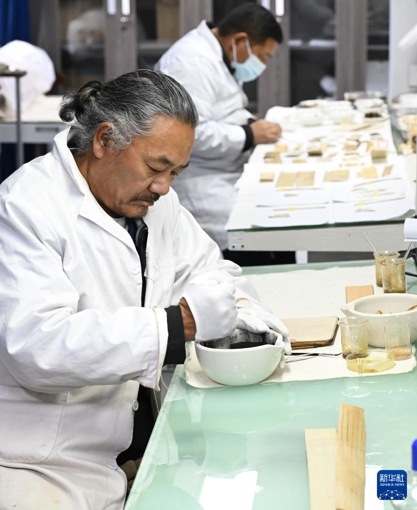 布達(dá)拉宮貝葉經(jīng)實驗性修復(fù)小組實驗室工作人員對用于貝葉修復(fù)的顏料進(jìn)行研磨處理(5月25日攝)。新華社記者 旦增尼瑪曲珠 攝?