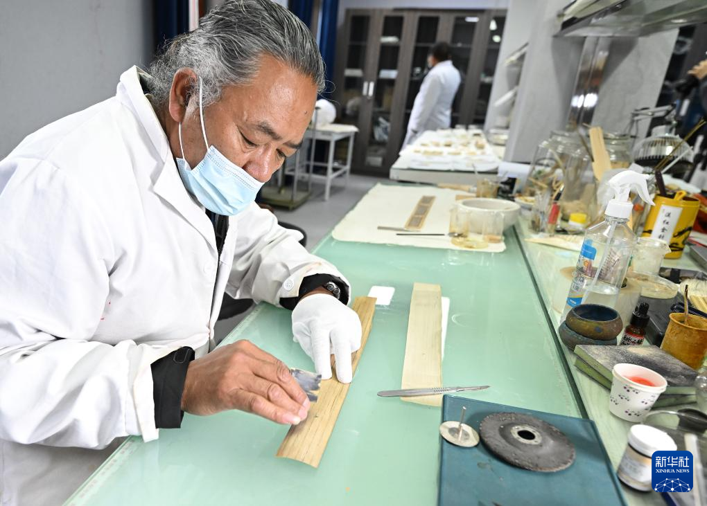 布達(dá)拉宮貝葉經(jīng)實驗性修復(fù)小組實驗室工作人員對貝葉進(jìn)行處理(5月25日攝)。新華社記者 旦增尼瑪曲珠 攝