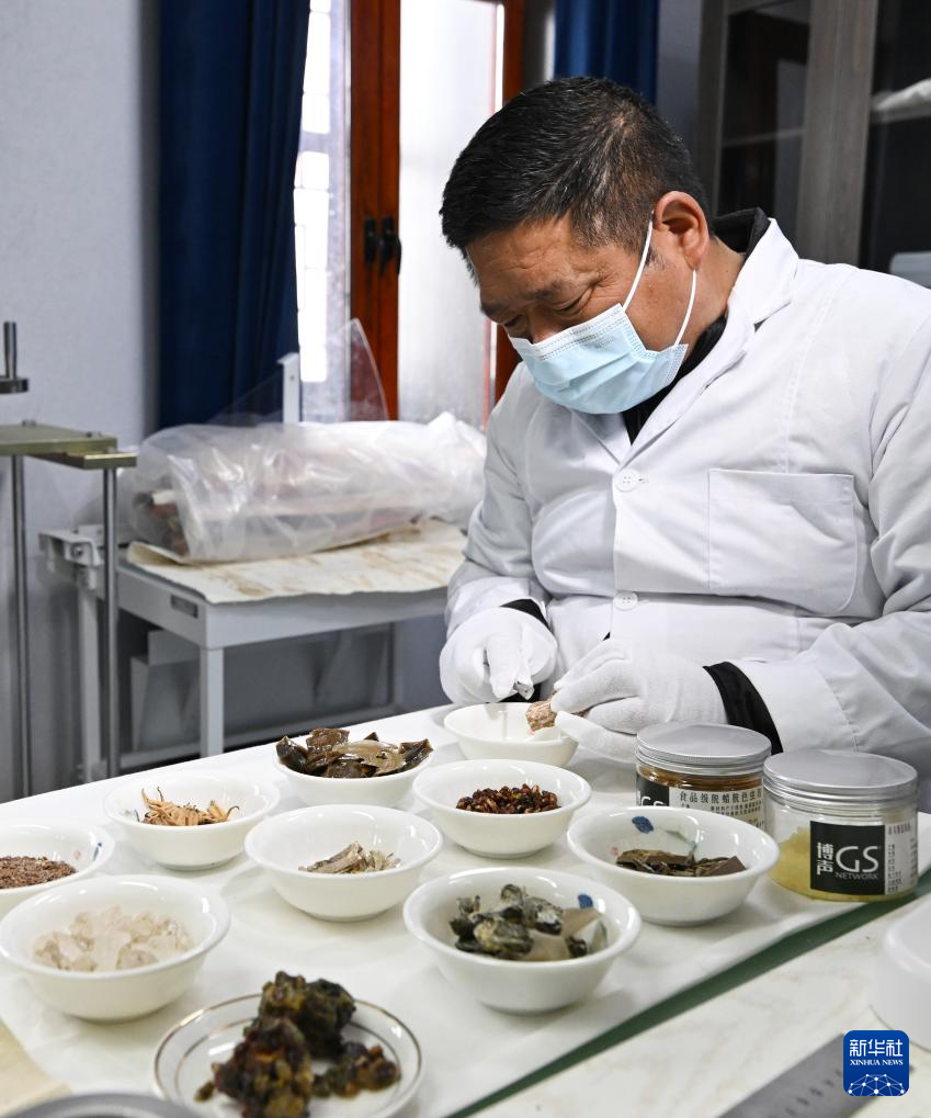 布達(dá)拉宮貝葉經(jīng)實驗性修復(fù)小組實驗室工作人員對用于貝葉修復(fù)的粘合劑原料進(jìn)行加工(5月25日攝)。新華社記者 李賀 攝?